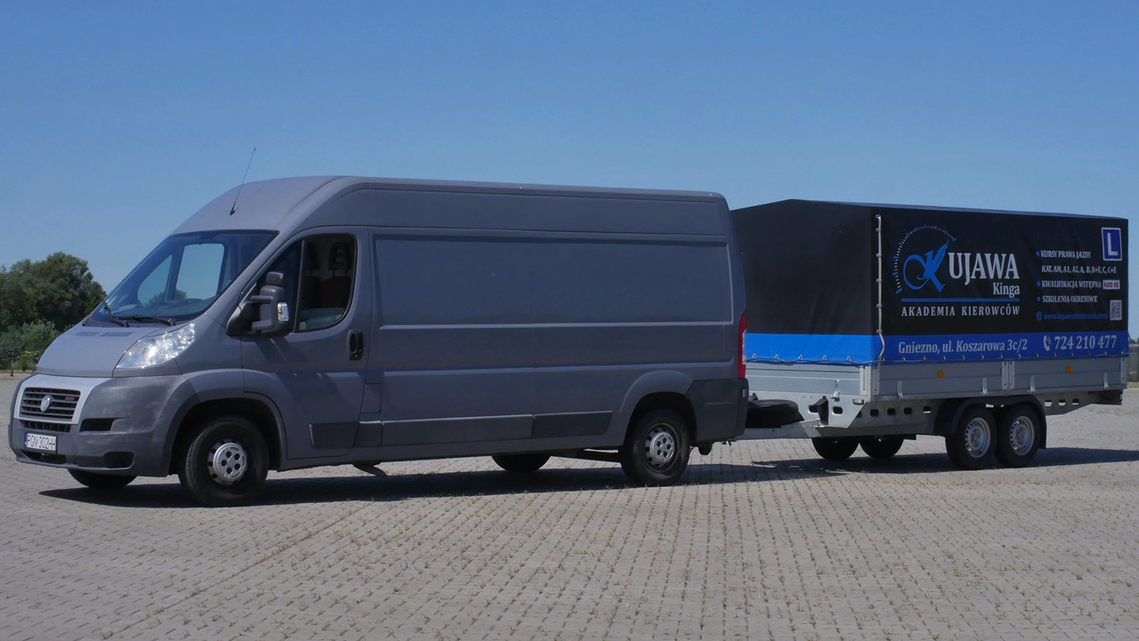 Szkolenie odbywa się na Fiat Ducato z przyczepą Rydwan, dzięki czemu ćwiczysz na rzeczywistym zestawie egzaminacyjnym.
